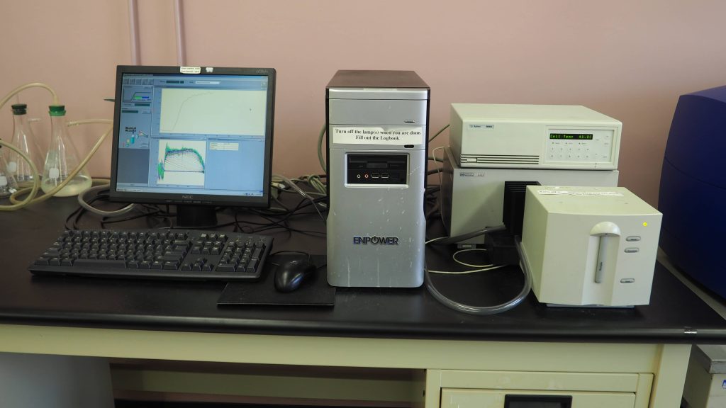 The HP UV-Vis is a standard spectrophotometer capable of single-read and kinetic measurements. The system is also equipped with an onboard Peltier Temperature Controller that allows for samples to be maintained at single temperatures, or read through series of temperatures (such as nucleic acid melting experiments). A basic set of cuvettes are provided for users, though certain samples may require researchers to provide their own.